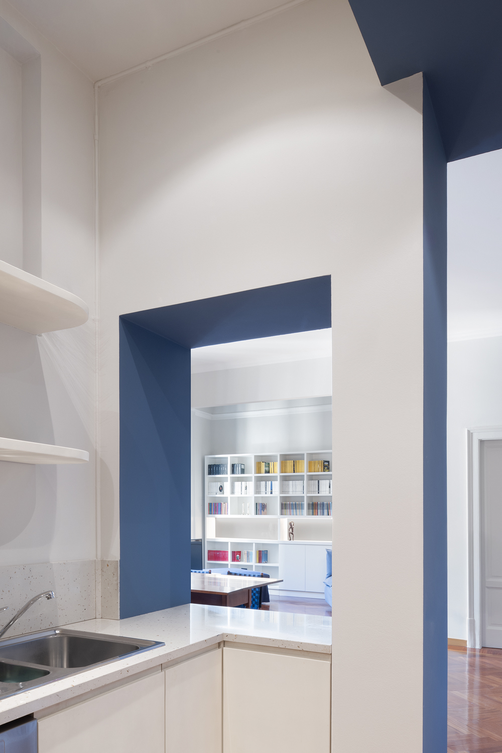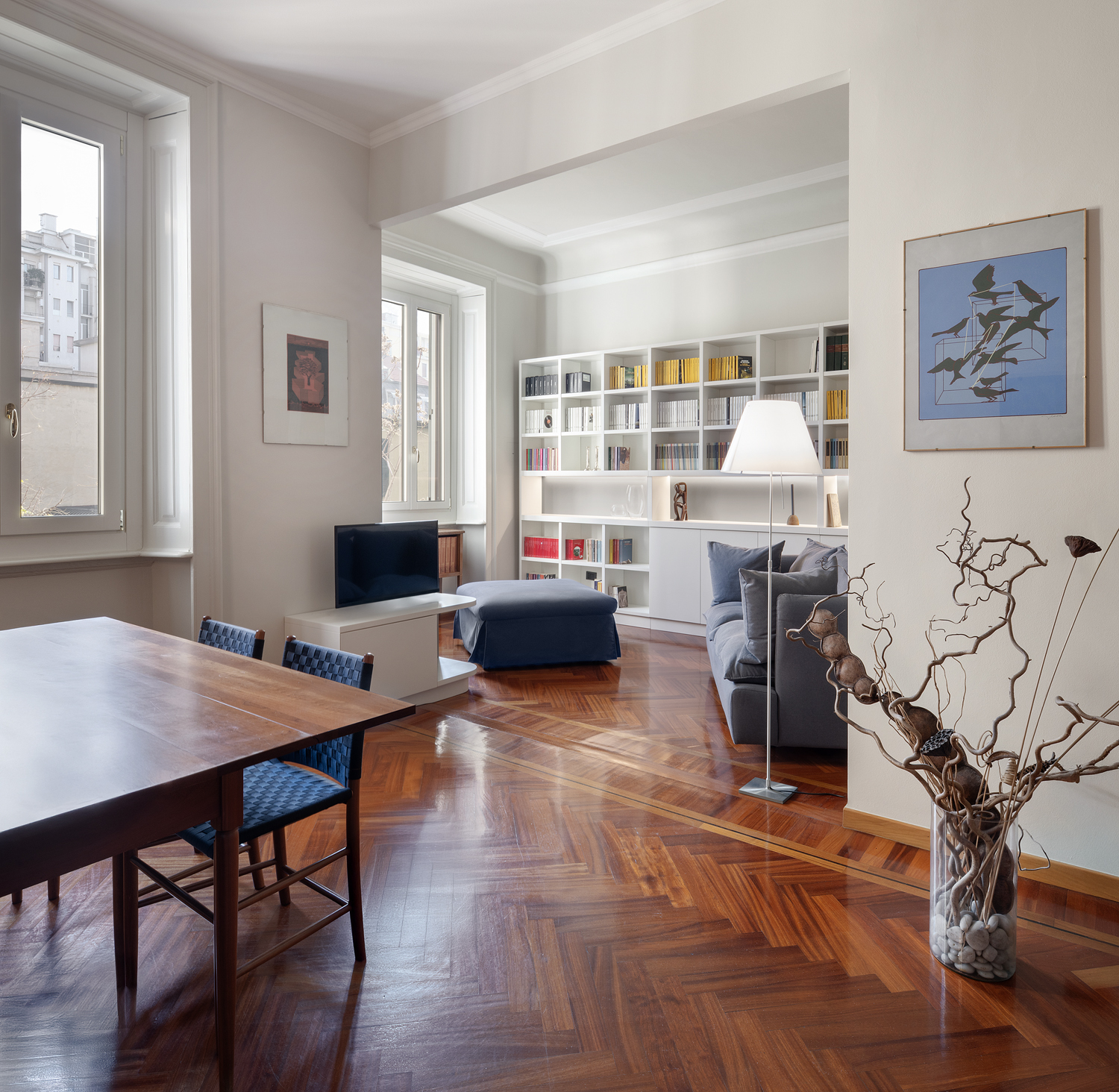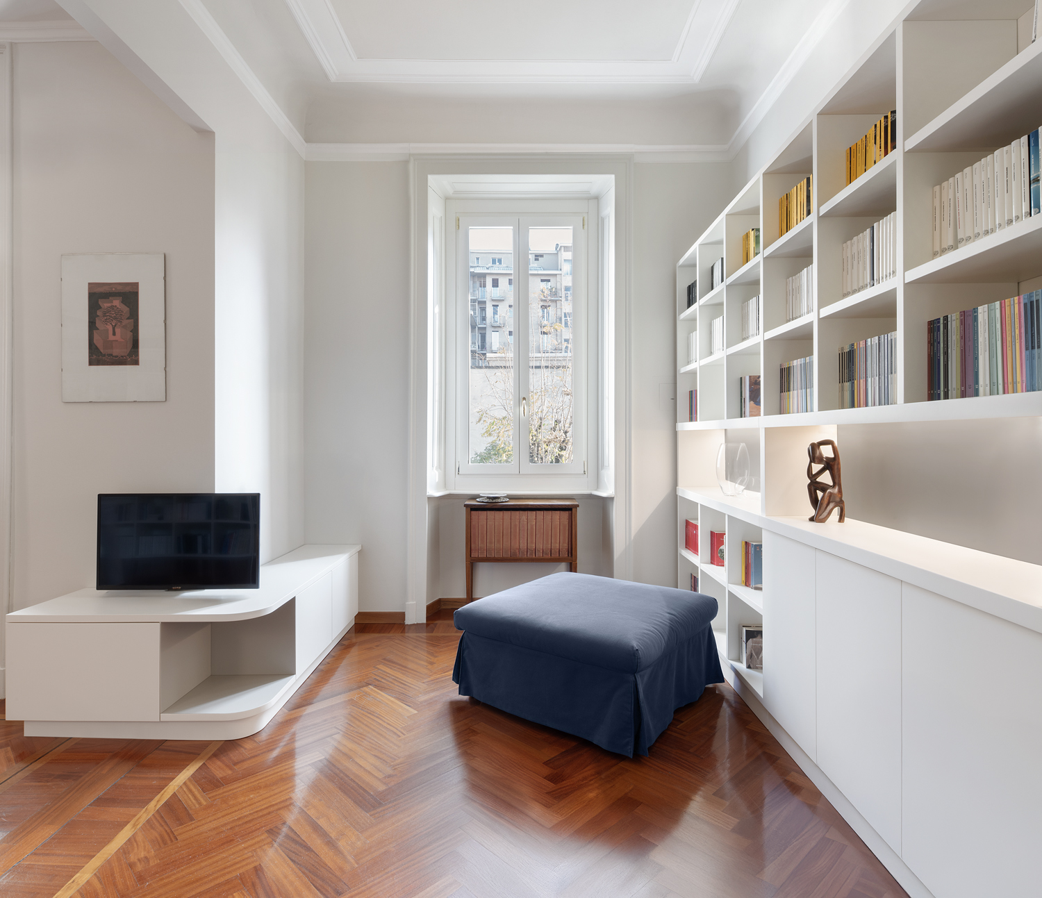 Il focus del progetto sono le due librerie a tutta parete, che definiscono e dilatano gli spazi di un ambiente living luminoso e accogliente, ottenuto grazie all’unione di due locali e all’eliminazione del corridoio.